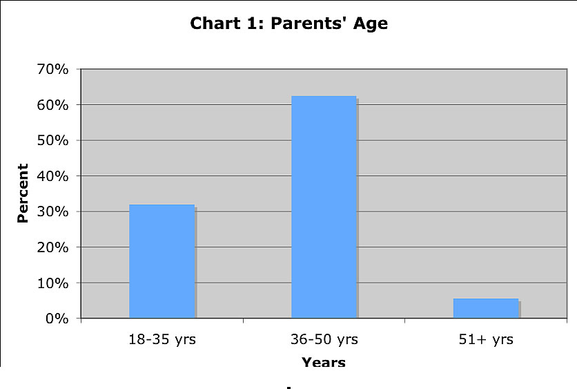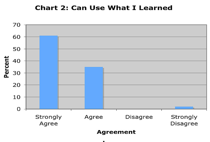 Parents were asked a number of questions to find out whether or not they valued the conference, how they felt about their schools and children’s teachers. As Chart 1 shows, slightly less than two thirds of all parents were between the ages of 36–50 years of age, with almost another third being between 18–35 years of age. Only a small percent were 51 years old or more. Parents were asked if they thought they would be able to use what they learned at the conference. As Chart 2 shows, nearly 100 percent of the parents agreed or agreed strongly that they could use what they learned. Only two percent strongly disagreed. (Click on graph to enlarge.)