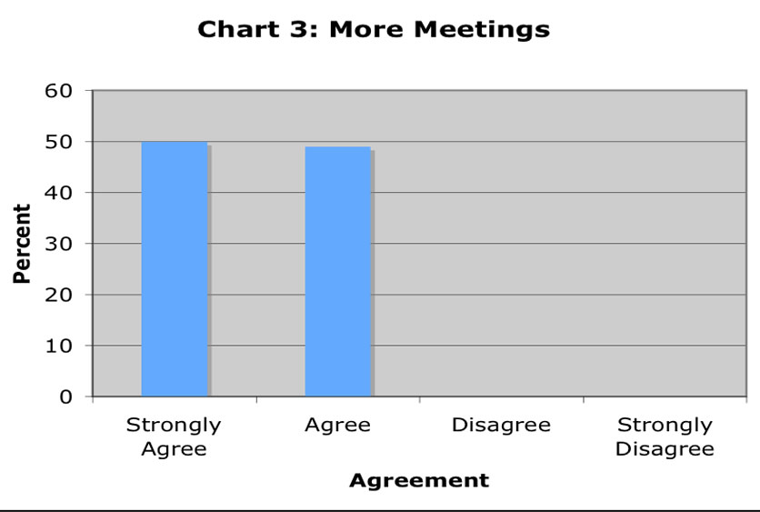 One parent said, "I love this activity..." and another elaborated saying, "After reading a story, I want to have my child write about what she learned from the book so she can learn writing skills." While many parents saw the value of helping to teach their children, others said that it was a "two way street" and that they learned from their children. One mother said, "I have learned a lot from my son." Parents were asked if they would like more meetings like this. As Chart 3 shows, parents were nearly unanimous in their agreement that they wanted more.