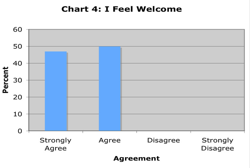 Many parents offered written comments and they were all positive: "Everything is good", "Now parents can show their children to improve their understanding", "It helped me understand my child’s schoolwork", and "It allows me to help when my child gets behind." Some other parents talked about the importance of getting more parents to come. One wrote, "We should break up the groups to get to know other parents and see what brought them here." Parents were also asked how they felt about their children’s school. One of the questions aimed to find out if parents felt welcome at school. Chart 5 shows that nearly all parents (97 percent) felt welcome at their children’s school.