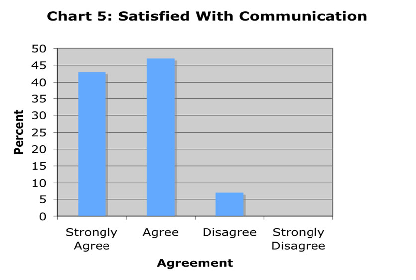 They were also asked what the school could do to make them feel even more welcome. Many comments were offered that "Everything is good", though some parents commented with ideas for improvement. Some said they wanted more communication from the school and "having more frequent meetings with teachers." Another parent commented that the school staff needed to have classes in how to be polite to parents because, "...there are people who are not [polite] and make parents feel bad." Yet another parent suggested that steps could be taken for "greeting and making parents feel that they are more welcome at school." Parents were also asked about the extent to which they were satisfied with communication with their children’s teachers. Chart 5 shows that the vast majority of parents (93 percent) were satisfied, but seven percent said they were not.