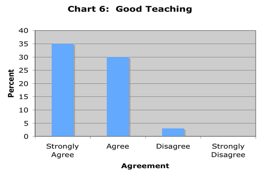 Parents were uniformly supportive of the translating service that Manual Arts High School and the Institute provided at the conference, and many said the schools should always make translators available. One parent suggested that teachers should speak Spanish. Most of the comments, however, pointed to the need for more frequent conferences with teachers, especially in cases where children were not doing well. One parent said, "When my son is failing I could be notified before receiving the report card." Another said, "Letting me know what my child isn’t doing in class before parent conferences by emails or a phone call." Another parent commented, "I need more personal time with the teacher to talk about my child’s progress." Finally, parents were asked to evaluate the quality of teaching their children were receiving. As Chart 6 shows, 93 percent of all parents agreed or agreed strongly that the teaching their children were getting was good teaching while a small percentage disagreed.